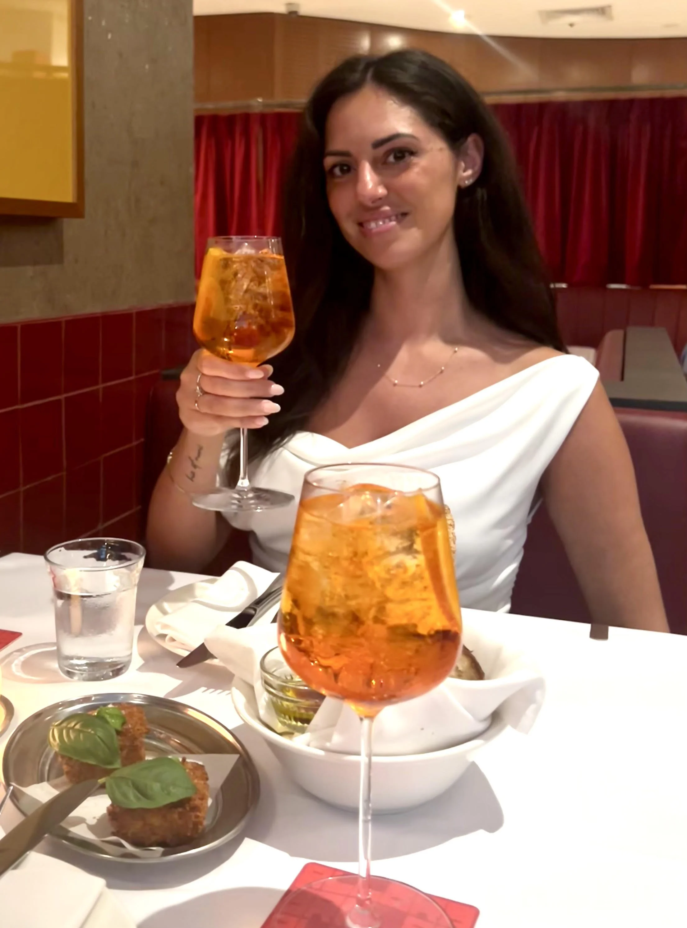 Her last meal on earth would be a proper Italian carbo feast: bruschette, pasta and an Aperol Spritz on the side.